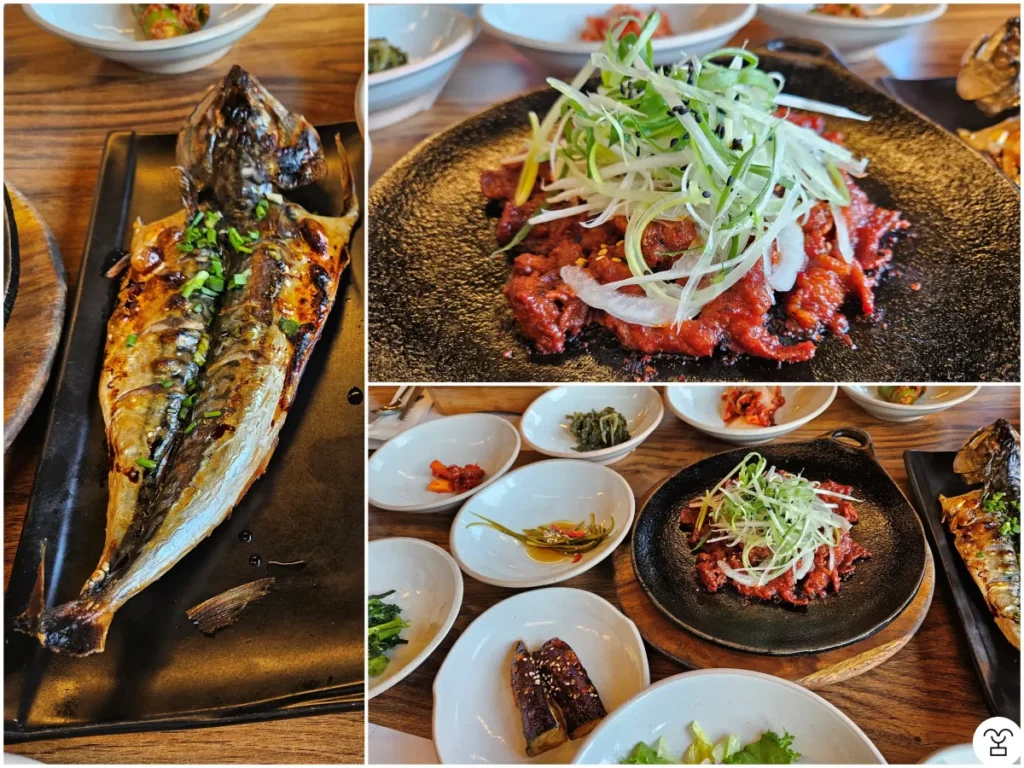 Haejeongsik untuk satu orang harganya 19.000 won. Saya memesan untuk 2 orang. Dalam Haejeongsik termasuk pork panggang langsung (jikhae jeyuk) dan ikan tenggiri panggang (grilled mackerel). Jikhae jeyuk-nya enak. Saya tidak mencoba ikan tenggirinya, jadi tidak tahu rasanya. Hal yang kurang menyenangkan adalah terlihat 2–3 lalat hidup. Lalunya bukan berasal dari makanan.